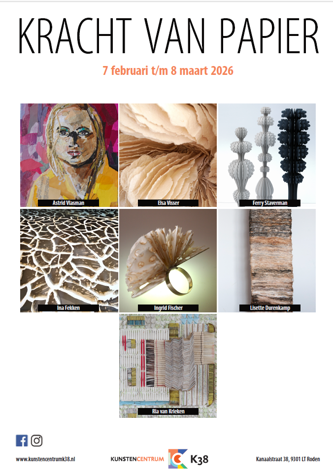 Een deel van mijn werk is 7 februari t/m 8 maart te zien in deze groepstentoonstelling over de veelzijdigheid van papier als beeldend materiaal bij Kunstencentrum K38 te Roden. Voor deze expositie heb ik een selectie van mijn sieraden gemaakt waarin de technieken van handgeschept papier, origami, boekbinden en edelsmeden samenkomen.